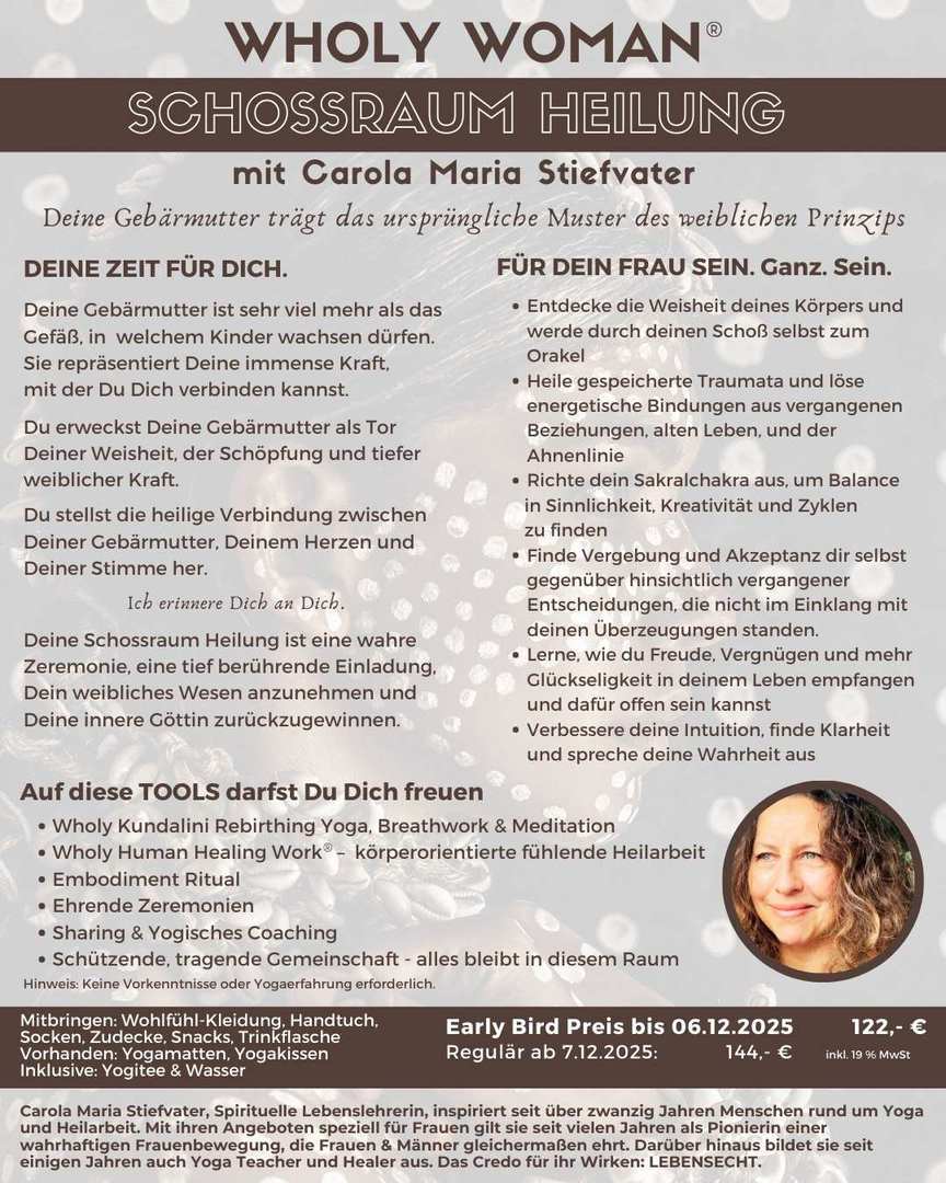 Mit Wholy Healing Work, einer von mir aus dem Sat Nam Rasayan® des Kundalini Yoga weiterentwickelten Heiltechnik, sehe ich vor allem bei Rückführungen in andere Leben, wie sehr das heutige Leben der Frau zutiefst geprägt ist von Erfahrungen, denen sie in früheren Leben ausgesetzt waren, wie z.B. Ausbeutung, Misshandlung, Unterdrückung, Verrat, Verbrennungen und Köpfungen, Vergewaltigungen, Denunzierungen und vielem Grausamen mehr.